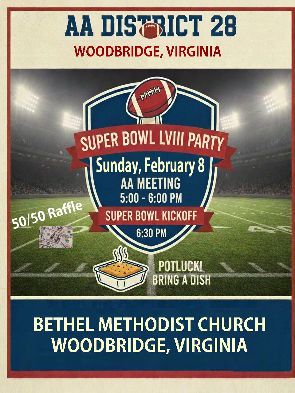 Join District 28 for Super Bowl LVIII with an AA meeting from 5:00pm - 6:00pm and the game kicking off at 6:30pm. This will be a potluck so bring a dish and partake in the 50/50 raffle. |